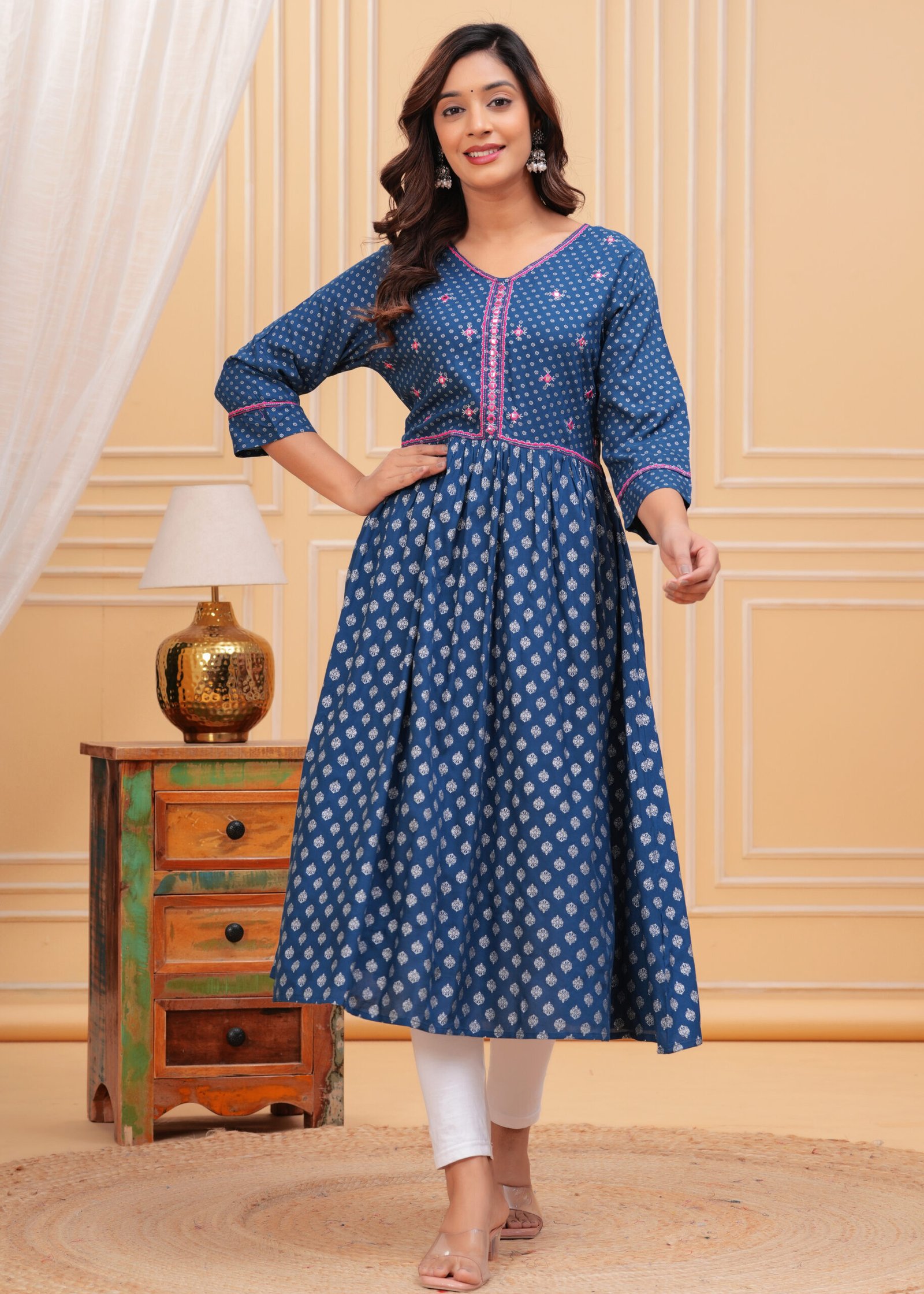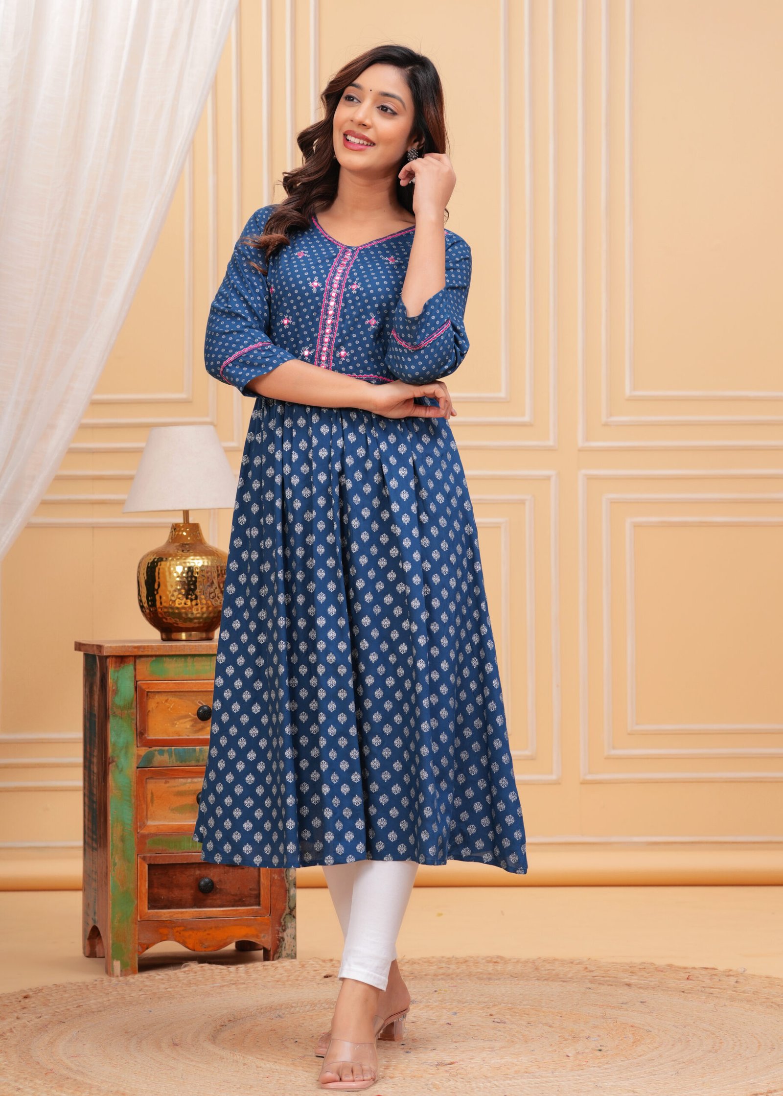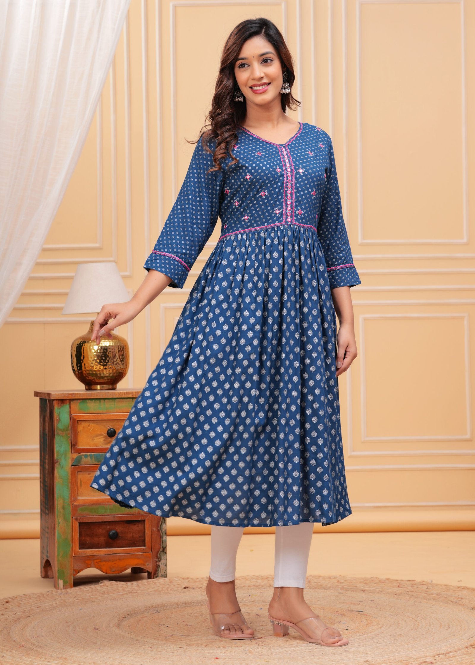 Designed with a V-neckline and three-quarter roll-up sleeves, this Anarkali ensures a flattering fit for every occasion. The standout mirror work detailing along the neck adds a hint of sparkle, elevating your look effortlessly. The dress is crafted in a calf-length, flared hem design that accentuates the classic Anarkali shape, making it a versatile pick for women who appreciate traditional styles with a contemporary twist. It’s time to make a statement with your wardrobe without compromising on your comfort.