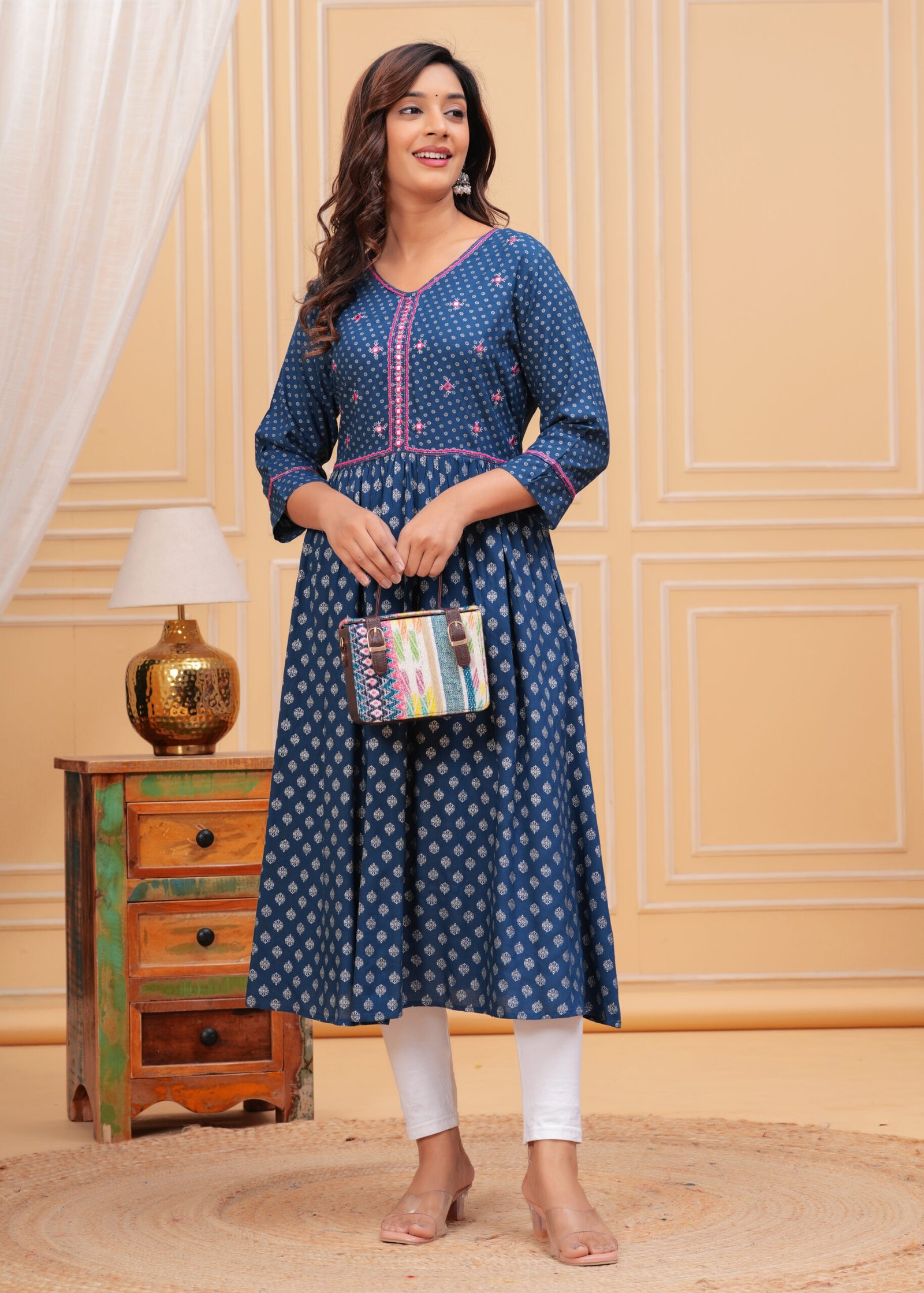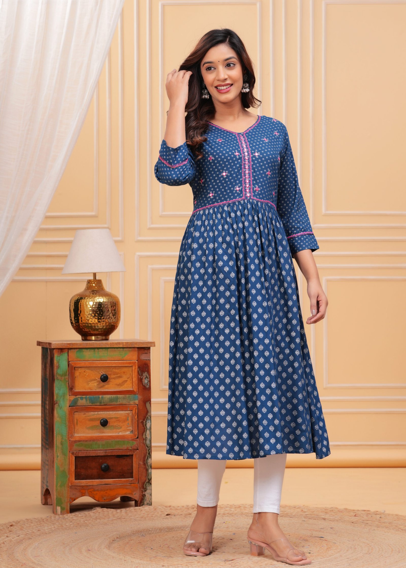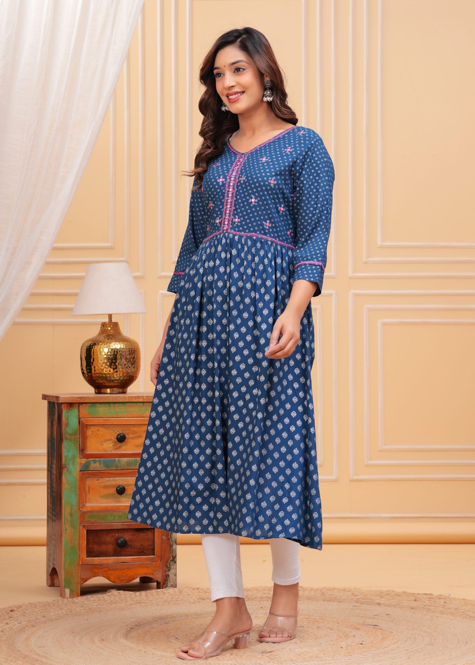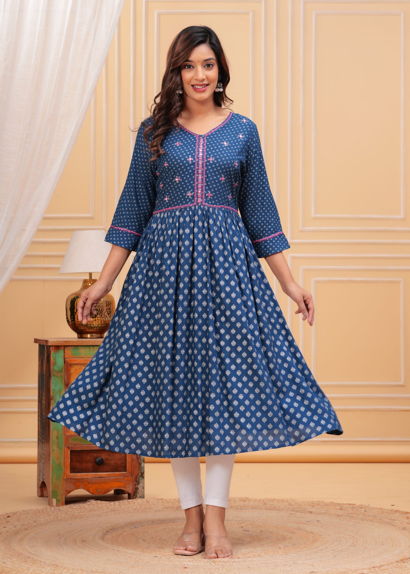 Designed with a V-neckline and three-quarter roll-up sleeves, this Anarkali ensures a flattering fit for every occasion. The standout mirror work detailing along the neck adds a hint of sparkle, elevating your look effortlessly. The dress is crafted in a calf-length, flared hem design that accentuates the classic Anarkali shape, making it a versatile pick for women who appreciate traditional styles with a contemporary twist. It’s time to make a statement with your wardrobe without compromising on your comfort.