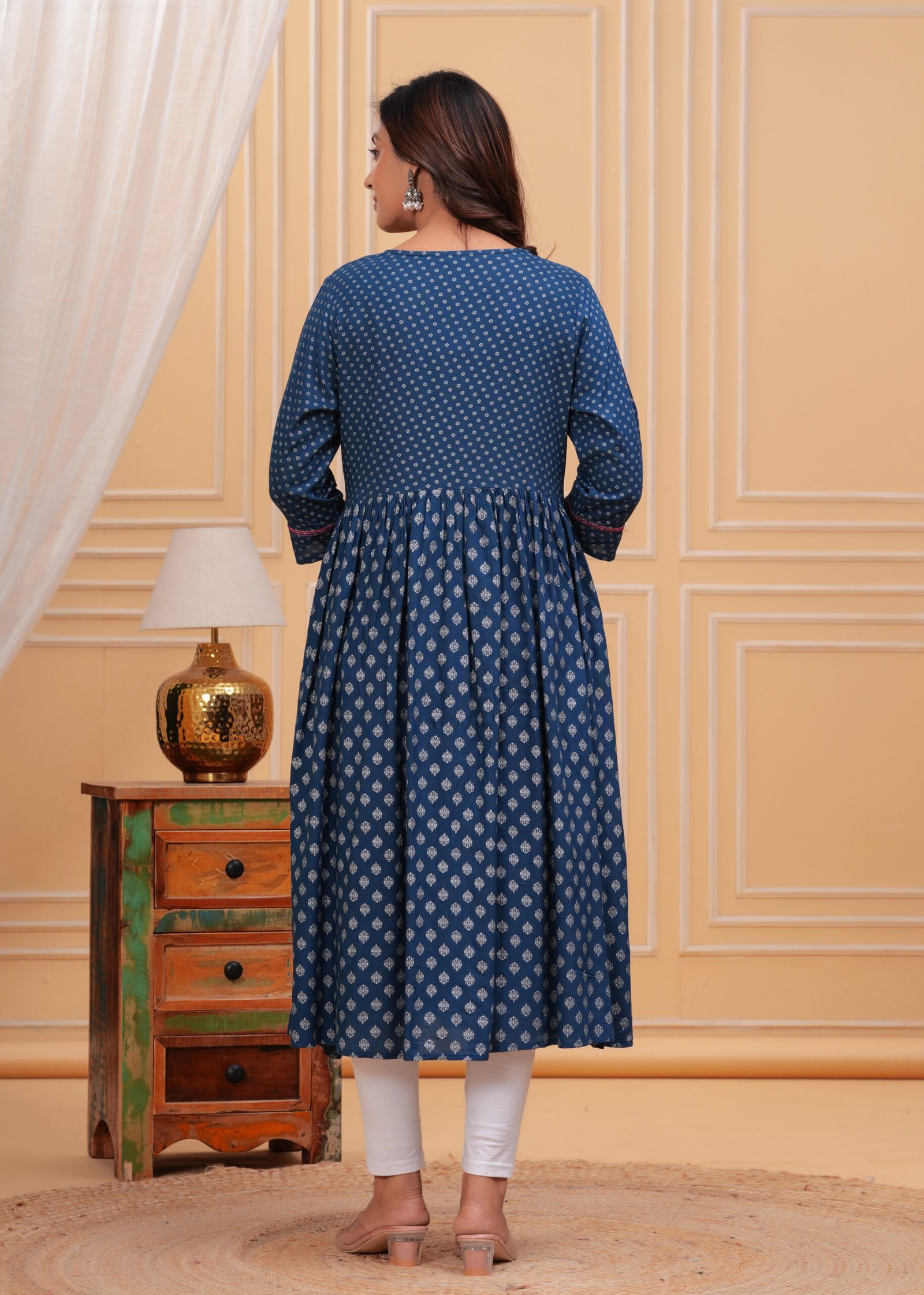 Step into a world of refined style with our blue and white Anarkali dress, effortlessly combining traditional aesthetics with modern comfort. This stunning outfit features intricate ethnic motifs printed on premium machine-woven regular cotton—a fabric that guarantees lightweight comfort for all-day wear. Whether you’re heading to a festive celebration or a casual gathering, this dress provides the perfect blend of elegance and functionality.