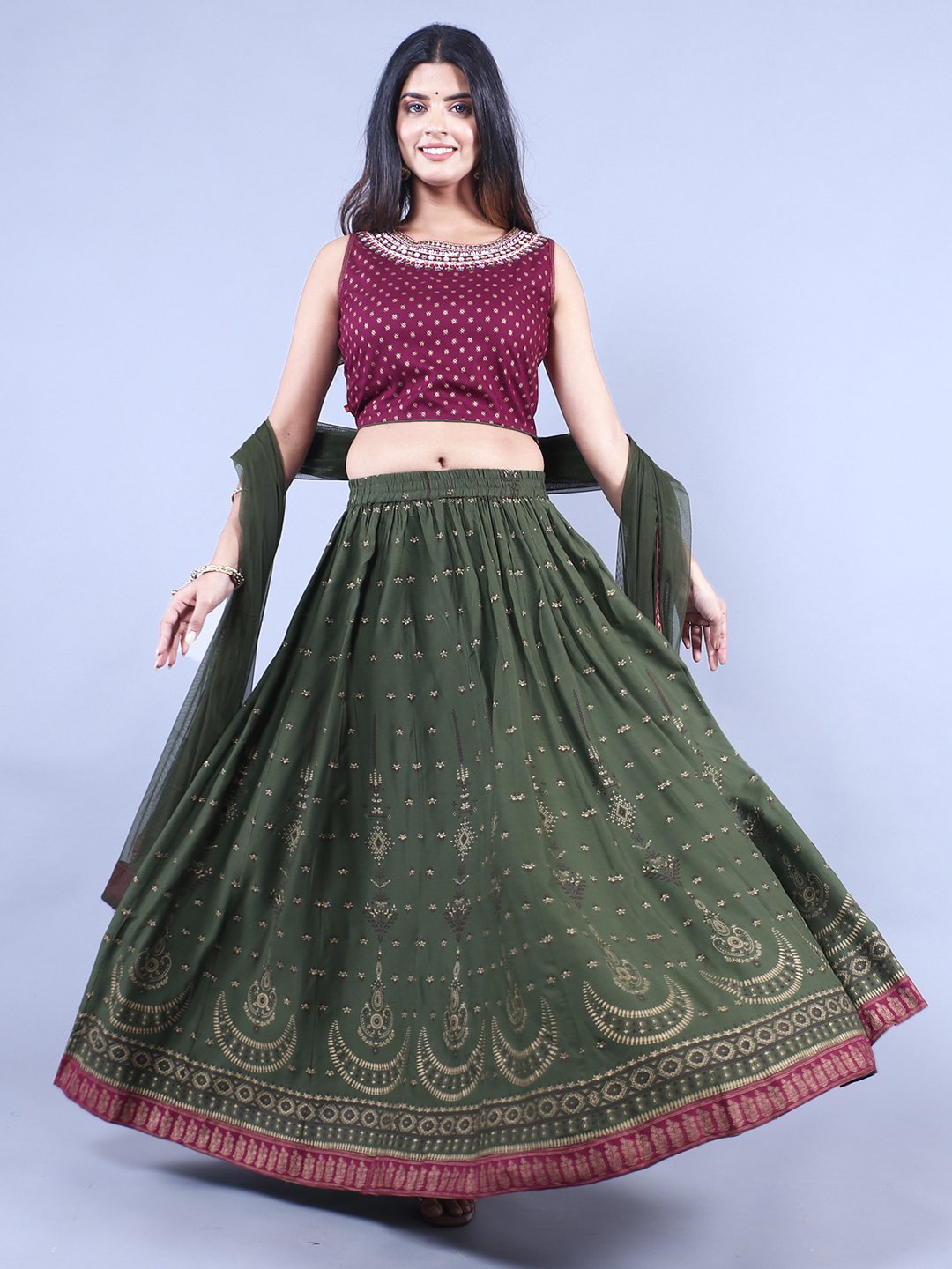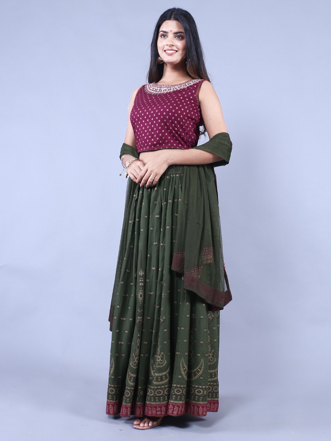 Green & Maroon Printed Ready to Wear Lehenga & Blouse With Dupatta