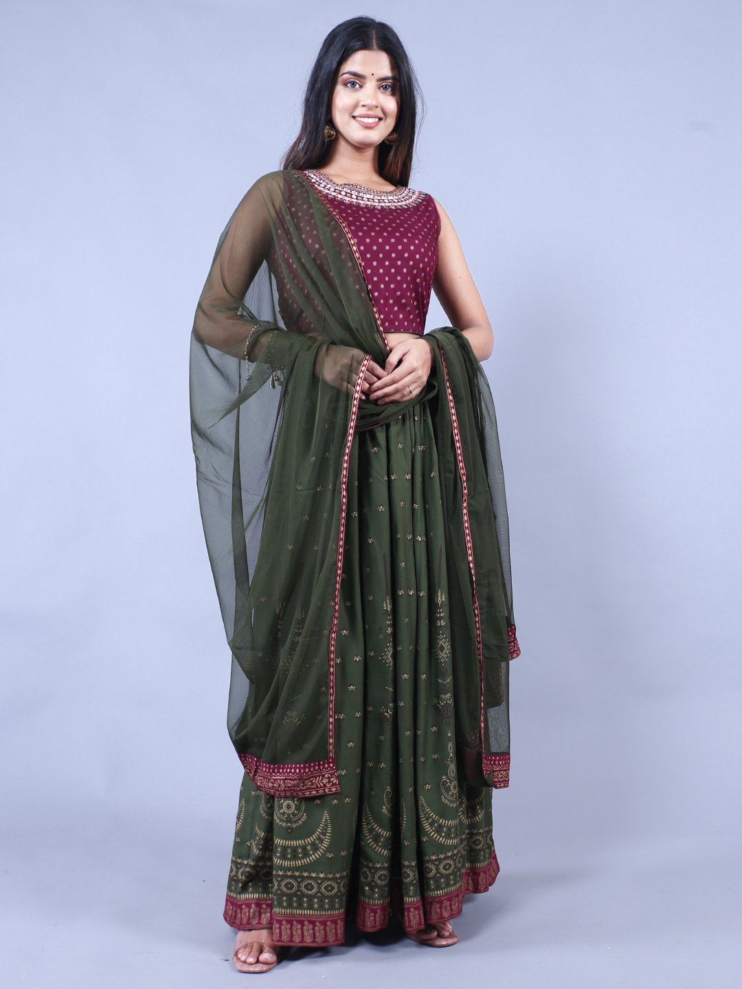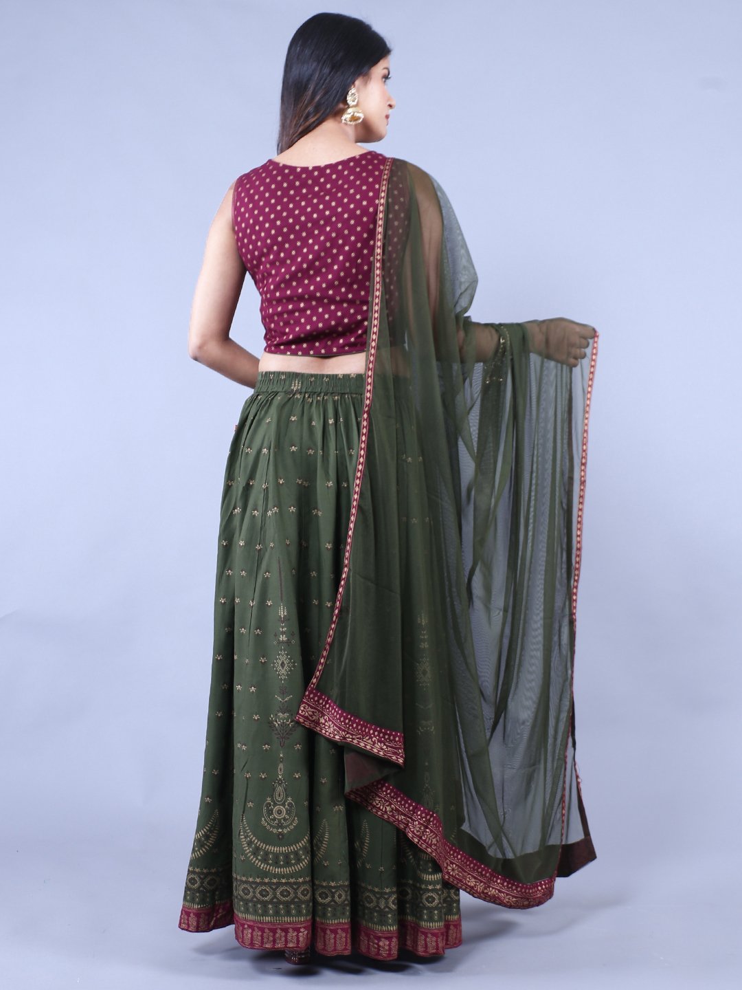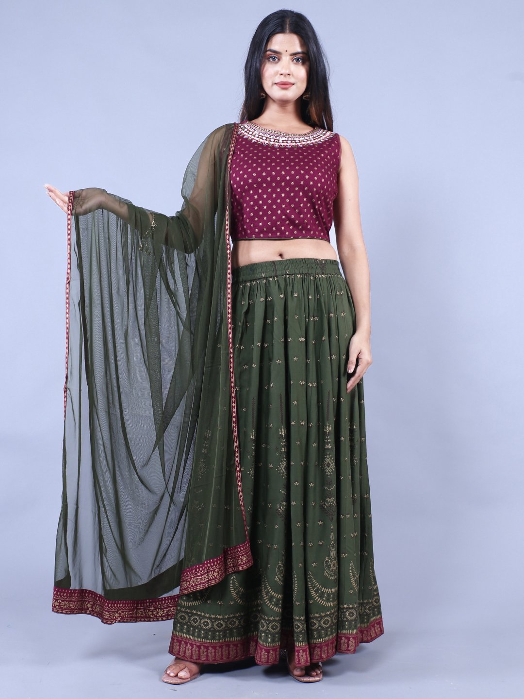 FEM-105Green & Maroon Printed Ready to Wear Lehenga & Blouse With Dupatta